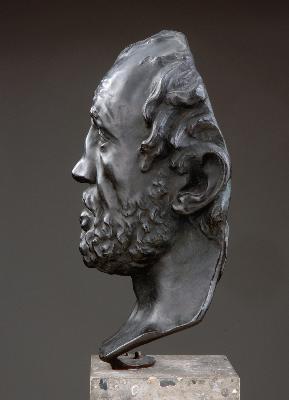 „Dieses Bildnis, das heißt Bildnis M.B., es kann heißen, es steht dann für Monsieur Bibi, das war ein Arbeiter, der sich auf dem Pferdemarkt als Arbeiter verdingt hat und Rodin hatte sein erstes Atelier dort in der Nähe, das heißt, er hat ihm Model gesessen. Es gibt zu dieser Entstehung ne Anekdote, dass eben das Tonmodell runtergefallen ist und deswegen ist diese Nase so deformiert, das heißt, man weiß auch nicht, ob dieser Arbeiter tatsächlich so ne gebrochene Nase gehabt hat. Bildnis M.B. könnte aber auch heißen, Michelangelo Buonarroti, dessen Bildnis kennt man, ein Renaissancebildnis, das ihn darstellt, wo er eben selber ne gebrochene Nase hat.