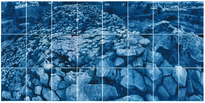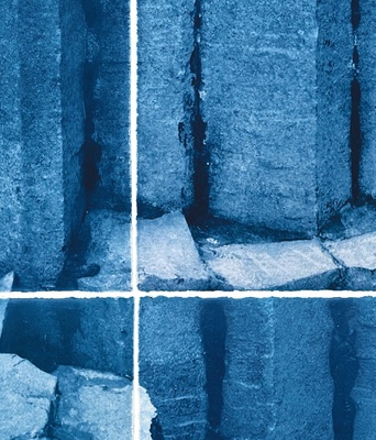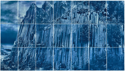 Aus der Entfernung betrachtet dominieren die Basaltstelen den Gesamteindruck der großen Tableaus. Auf Vorder- und Hintergründe in den Bildern hat die Künstlerin meist verzichtet, es scheint nicht beabsichtigt, Panská skála geografisch zu verorten. Die Einzelblätter lenken den Blick weiter auf Ausschnitte und Details, die durch ihre Vergrößerung und damit verbundene Unschärfe auf dem samtigen Büttenpapier beinahe ungegenständlich wirken. So erlebt man ein quasi abstraktes All-Over des Gesteins, hervorgehoben sind das vertikale Linienraster der Basaltpfeiler und das Wabenmuster der Querschnitte. Die Bildwirkung wird vom Blau beherrscht. Die monochromen Tonwerte verleihen dem Basaltgestein eine transparente Erscheinung und verstärken deren Bildpräsenz, während die ebenfalls in Blau getauchten übrigen Bildelemente wie die Büsche, der kleine See oder die Häuser im Hintergrund an Sichtbarkeit einbüßen. Dieser Effekt ist bei Cyanotypien stärker als bei Schwarz-Weiß-Fotos, was mit unserer gängigen Seherfahrung zusammenhängt: Alte Fotografien aber auch Drucke und Zeichnungen sind üblicherweise schwarz-weiße Bilder.