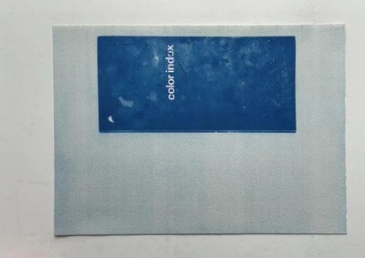 Neben den großen Tafeln sind die ungebundenen Bögen zweier auf Anna Atkins verweisende Künstlerbücher ausgestellt: Eines zeigt technische Zeichnungen in der Art historischer Blaupausen, das andere verwandelt ein Spektrum von 2500 Farben auf Blauabstufungen.