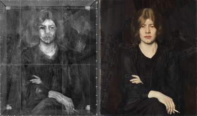 Immer wieder verwies der Maler in seinen Frauenbildnissen auf dunkle, gedankenschwere Seelenzustände. Die Eindringlichkeit des Bildnisses wird gesteigert, indem Zwintscher das helle, samtige Inkarnat von Gesicht, Hals und Händen sowie das Aschblond der Haare in hellen Tönen im Kontrast zur schwarzen Kleidung und zum schwarzgrauen Hintergrund erstrahlen lässt. Allein die glutrote Zigarettenspitze und das Rot der sinnlichen Lippen setzen Farbakzente.