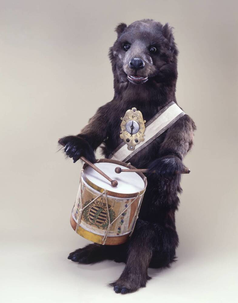 - Holzkopus aus Lindenholz mit einem Fell (Wildschwein?) bespannt, Zifferblatt aus vergoldetem Kupfer, Weckerwerkscheibe versilbert, Zeiger gebläut, Werk aus Stahl, Messing, graviert, vergoldet, versilbert, polychrome Fassung, Leder, Pappe, Textil