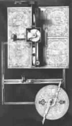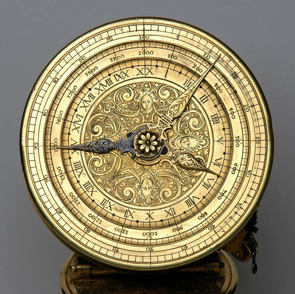 So hört es sich an, wenn der Wagenwegmesser arbeitet, den der Dresdener Instrumentenbauer Christoph Trechsler 1584 extra für den Kurfürsten anfertigte. Es ist das Gerät links oben, mit dem kleinen Tischchen davor. Von allen Wegmessern ist dies der bequemste und schnellste: Man konnte ihn nämlich auf einen Wagen montieren und so im Fahren die Radumdrehungen zählen. Eine Kette verband einen Schalthebel am Wagenrad mit dem Gerät, das die Radumdrehungen zählte und auf dem Ziffernblatt oben anzeigte, und zwar gleich in dem damaligen Längenmaß der Rute. Der Umfang des Wagenrades betrug viereinhalb Meter, und das entsprach genau einer Rute. Das Zifferblatt zählte auf der äußeren Skala die Ruten von 0 - 100, auf der mittleren dann die von 100 bis 2000. 2000 Ruten entsprachen einer Meile - war diese Strecke abgefahren, so rückte der Zeiger auf der innersten Skala, der Meilenskala, eine Einheit weiter.