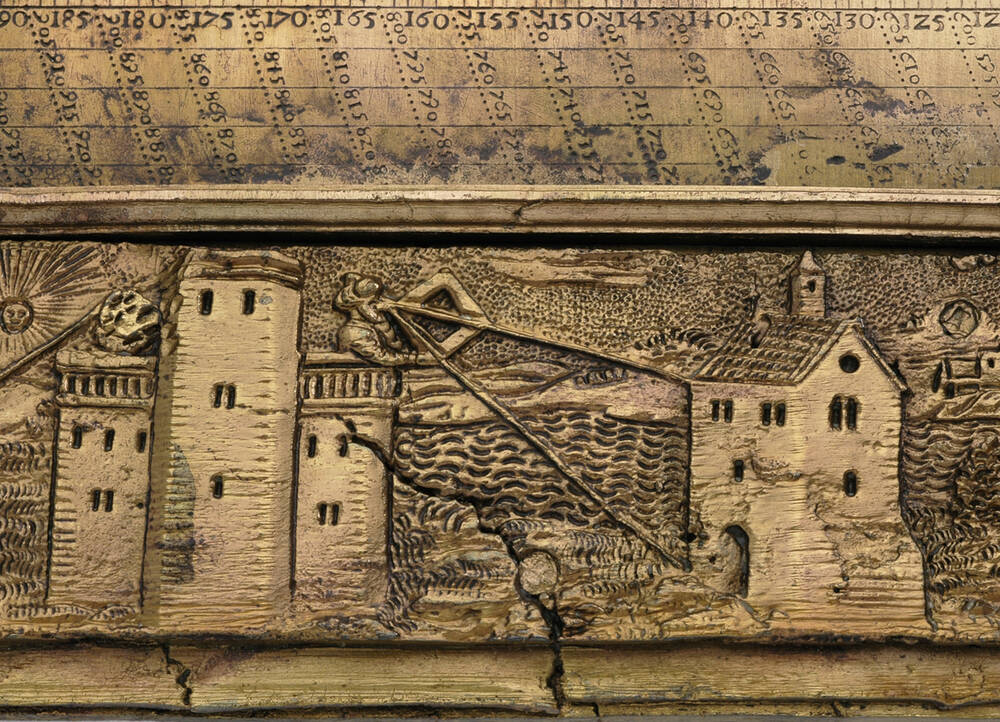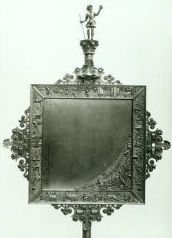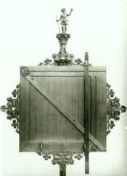 Bei dem Bombenangriff auf Dresden 1945 wurde das Instrument stark beschädigt. Was Sie hier sehen, ist nur noch das eigentliche Messquadrat; früher stand es auf einer Säule und war an allen vier Kanten mit Schmuck versehen, bekrönt von der kleinen Figur eines Arabers mit Messstab und Quadrant - eine Hommage an das Volk, das sich besonders um die Messtechnik verdient gemacht hatte.