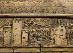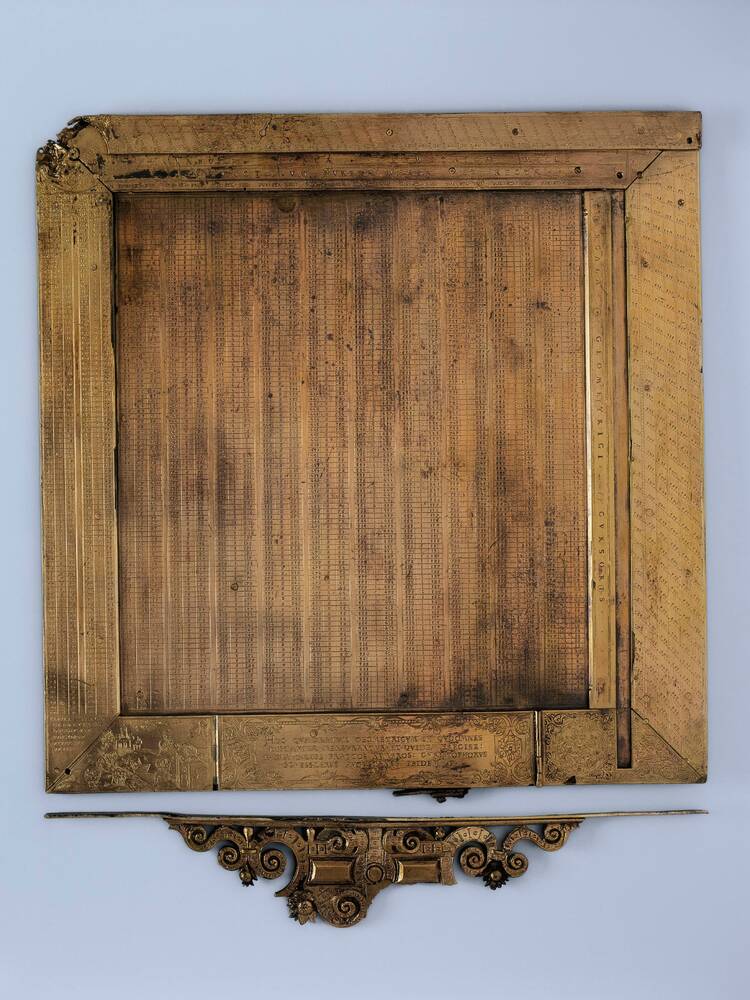 Dieses Quadratum Geometricum oder „Messquadrat“ ist ein Messinstrument zur indirekten Streckenmessung. Man maß damit solche Strecken, die nicht direkt begehbar waren. Zum Beispiel die Höhe eines Turmes; oder die Entfernung zu einem Ort, der unerreichbar war, weil er am anderen Ufer eines reißenden Flusses lag, oder inmitten von feindlichem Gebiet. Solche Messquadrate gehörten im 16. Jahrhundert zum normalen Instrumentarium eines Feldmessers; dieses hier ist allerdings besonders schön gearbeitet. Kurfürst August erwarb es von dem Augsburger Instrumentenbauer Christoph Schissler im Jahr 1569.