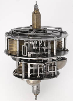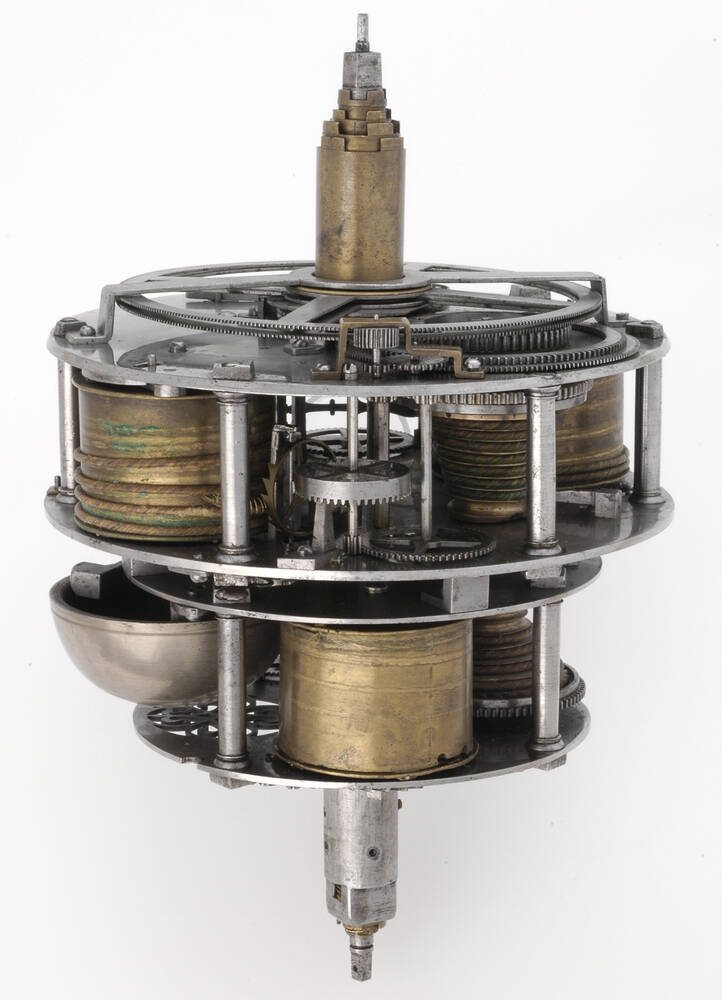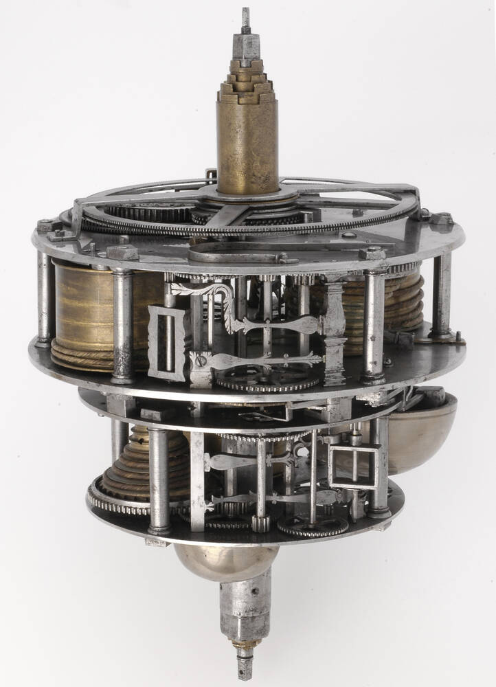 Dieses vergoldete Wunderwerk aus dem Jahr 1586 besteht aus einem Himmelsglobus in der Mitte, einem Erdglobus darunter und einer kleinen Armillarsphäre ganz oben - was das genau ist, erfahren Sie in unserer Ausstellung an anderer Stelle. Der Clou bei diesem Stück ist ohnehin ein ganz anderer: Im Inneren des Himmelsglobus mit seinen so überaus lebendigen Sternbildern steckt nämlich ein kompliziertes Uhrwerk; zieht man es auf, so dreht sich der Globus in 24 Stunden einmal um seine Achse. (Uhrticken) Am nördlichen Himmelspol sehen Sie außerdem zwei Zifferblätter, das obere zeigt die Viertelstunden an, das untere 24 Stunden. (Schlagwerk) Und schließlich bewegt das Uhrwerk auch noch Sonne und Mond! Beide sind an eisernen Meridianringen angebracht und werden entlang eines weiteren Eisenringes längs der Ekliptik geführt. Die Sonne hat ein eingraviertes Gesicht; der Mond ist zur Hälfte golden und zur anderen Hälfte dunkelblau. Und schließlich wird der Mond in seinem Umlauf auch noch gedreht, so dass man die Mondphasen sieht, weil sein Eisenring über der Ekliptik kleine Zähne und ein kleines Schaltrad hat.