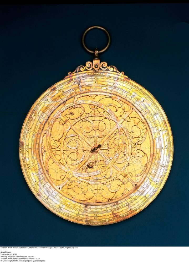 Eine Uhr ist es nicht, was Sie hier sehen - aber die Uhrzeit kann man mit diesem Instrument schon bestimmen, und dazu noch vieles mehr. Dies ist ein Astrolabium. „Astron“ ist griechisch und heißt „Gestirn“, „labis“ bedeutet „Zange“, und tatsächlich kann man damit die Sterne „in die Zange nehmen“; die wichtigste Funktion des Instruments besteht nämlich darin, den Stand der Gestirne zu einer bestimmten Zeit und an einem bestimmten Ort zu bestimmen - und darüber auch die Uhrzeit. Das Astrolabium war ursprünglich ein rein wissenschaftliches Instrument für Astronomen, aber seit dem 15. Jahrhundert avancierte es zu einem beliebten Sammelobjekt an fürstlichen Höfen. Dies Instrument hier ist eines der schönsten Astrolabien überhaupt; es wurde von einem Instrumentenbauer namens Thomas Pregel gefertigt, in Zwickau im Jahr 1629. Wenn Sie genau hinschauen, sehen Sie auf den rankenartigen Messingschleifen eingraviert die Namen von Sternen.