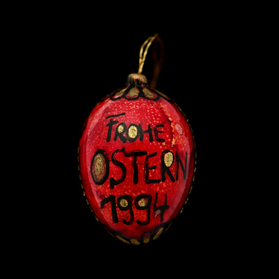 Ei-Gestaltung ist – im Gegensatz zu einer ebenen Fläche – nicht jedermanns Sache, denn die komplex geformte Oberfläche muss in drei Dimensionen bearbeitet werden. Und auch im Bereich der Ei-Gestaltung gilt: je kleiner, desto kniffliger. Um sich dieser feinmotorischen Herausforderung zu stellen, wählte Bettina Lau-Lange bewusst ein solch kleines Ei für die künstlerische Gestaltung aus. Die eine Seite ziert ein prächtiger Hahn, die andere Seite wünscht »Frohe Ostern 1994«.