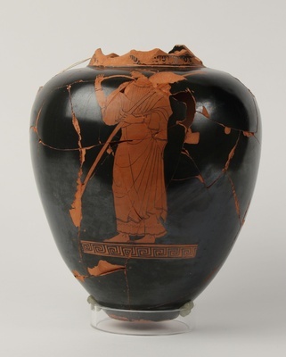 Von der Halsamphora ist nur der Gefäßbauch übriggeblieben, Hals und Fuß fehlen. Nichtsdestotrotz verzaubert die präzise Darstellung durch die unglaubliche Linienführung und den unverwechselbaren schwarz-rot-Kontrast, der die Einzelfigur regelrecht aus dem Hintergrund hervortreten lässt. Auf einem geflügelten Wunderwagen sitzt ein Jüngling in feinstem Ärmelchiton, mit Myrte bekränzt. In der Hand hält er Zepter und Getreideähren. Es handelt sich um Triptolemos, Sohn des Königs von Eleusis und Schützling der Demeter. Sie ist auf der Rückseite dargestellt, die Sie unten sehen können. Die Göttin der Erde, des Wachstums und der Fruchtbarkeit lehrte Triptolemos den Getreideanbau, beschenkte ihn mit dem Wagen und ließ ihn so ausgerüstet den Menschen auf der Erde den Segen des Ackerbaus kennenlernen. Außerdem führte sie ihn in die Mysterien von Eleusis ein. In dieser Ortschaft in Attika lag das große Heiligtum der Göttin und die dort zelebrierten Geheimriten versprachen ein glückliches Leben nach dem Tod.