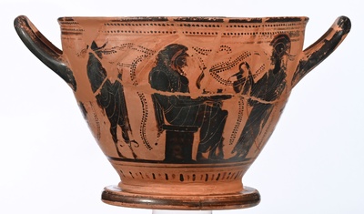 Auf dem Skyphos, den wir näher anschauen wollen und der um gut einhundert Jahre älter ist, als die anderen, ist in der Mitte Herakles dargestellt. Der Held im Löwenfellmantel sitzt, hält eine Schale (Phiale) in den Händen und ist entgegen seines sonstigen kämpferischen Tatendrangs ganz inaktiv. Er lässt sich von seiner Schutzgöttin Athena mit einer Trankspende umsorgen. Der Götterbote Hermes begleitet die Szene mit seinem Flötenspiel.