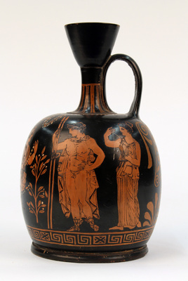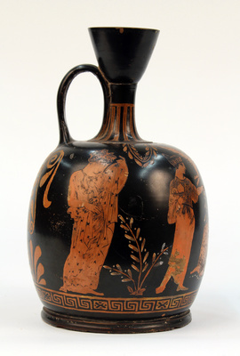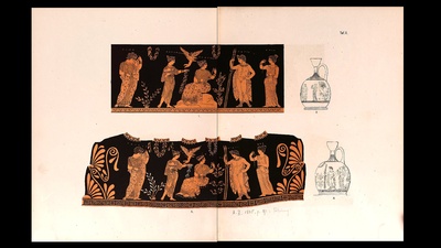 Hätten Sie gedacht, dass es sich dabei gar nicht um antike Vasenmalerei handelt? Das Gefäß als solches scheint antik und war ursprünglich entweder unverziert oder schlecht erhalten. Jedenfalls hat ein Fälscher die umlaufende Darstellung erst nachträglich aufgebracht. Dafür hat er den schwarzen Glanzton teilweise abgekratzt und den rötlichen Tongrund freigelegt. Auf die aufgeraute Oberfläche trug er dann eine hauchdünne Schicht Gips auf. Auf diese brachte er anschließend die Figuren und Ornamente mit roter, und die Binnenzeichnung mit schwarzer Farbe auf. Bei der Darstellung ist er wenig kreativ vorgegangen. Er hat sich einfach eine Bauchlekythos in der Art des Meidias-Malers vorgenommen, die 1846 ans British Museum gelangte und aus Ruvo stammen soll. Eine Abrollung beider Vasen aus einer Publikation von 1865 sehen Sie untenstehend. Vielleicht finden Sie, wie bei einem Suchbild die Unterschiede. Diese sind allerdings so marginal, dass neben den technischen Auffälligkeiten, auch die nahezu genaue Übereinstimmung gegen eine antike Entstehung spricht. Denn Kopien wie in der Skulptur, gibt es in der Vasenmalerei nicht.