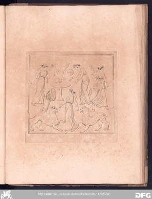 Fällt Ihnen auf, dass die in einen Mantel gehüllte Frau auf dem Lehnstuhl und der Schwan, der sich auf ihrem Schoß niedergelassen hat, mit viel feinerem Pinselstrich gemalt sind? Das liegt daran, dass ein findiger Restaurator, Fälscher oder Verkäufer das Bild erst nachträglich auf den Bauch des antiken Gefäßes aufbrachte. Vermutlich, weil es an dieser Stelle beschädigt war und sich sein Verkaufswert mit einer solchen Maßnahme erhöhen ließ. Für seine Komposition, bei der er vielleicht an die Geschichte von Leda und den Schwan dachte, griff er auf antike Vorbilder zurück und benutze als Vorlage eine weitere einflussreiche Publikation Hamiltons, nämlich die seiner zweiten Sammlung. Illustriert und vorgelegt durch den Maler Johann Heinrich Wilhelm Tischbein (1751-1829), der 1800 schrieb: „Dem Hamilton […] haben wir es zu danken, dass die Vasen für Kunstsachen sind erkannt worden, denn vorher glaubte man, es wären Töpfe nur mit Figuren verziert worden […]“.