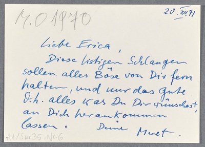 Ein besonderes Dokument aus dem ADA-Archiv ist diese handschriftliche Nachricht der Künstlerin Meret Oppenheim an ihre Galeristin Erica Brausen, geschrieben am 20. Dezember 1971. Die Vorderseite der Nachricht zeigt eine Schwarz-Weiß Fotografie von zwei kunsthandwerklich gefertigten Schlangen-Köpfen. Der Text der Nachricht lautet: „Liebe Erica, diese listigen Schlangen sollen alles Böse von dir fernhalten, und nur das Gute d.h. alles was du dir wünschest, an dich herankommen lassen. Deine Meret“. Wie aus diesem und anderen Schriftwechseln zwischen Meret Oppenheim und Erica Brausen hervorgeht, verband die beiden befreundeten Freigeister mehr als nur eine geschäftliche Beziehung.