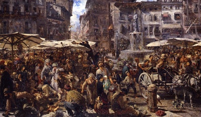 'The painting I have chosen depicts the lives of people in all their facets. It shows fatigue, hunger, poverty, power, distress, oppression, and inequality. Wealthy people look down on the poor with disdain, as if they are not their equals. Vagabonding children and beggars dominate the scene. At the center is the statue of an unjust ruler by the well, who makes people work just so they can eat, even though their faces are marked by exhaustion. There is no security. Without this work, they cannot live or survive. Even the donkey pulling the cart looks worn out.