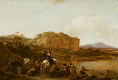 Wenn wir das Bild mit den Fischern am See weiter rechts vergleichen, einem Gemälde des Niederländers Nicolas Berchem aus dem Siebzehnten Jahrhundert, fallen gleich mehrere Parallelen auf: Zum einen beherrscht hier wie dort ein großer Steinblock das Zentrum – bei Friedrich der Deckstein des Hünengrabs, bei Berchem ein großer Fels in der Landschaft. Um die Wirkung der Steinblöcke zu verstärken, lassen beide Künstler wie ein Echo Wolken darüber schweben – wobei Friedrich eine dunkle Regenwolke zentral über dem Grab positioniert, während Berchem seine freundlich-helle Wolke leicht nach rechts versetzt anordnet. Weiterhin stehen auf beiden Bildern links von den Steinblöcken Büsche, die sich im Wind ganz ähnlich krümmen. Schließlich wechseln sich hier wie dort im Vordergrund helle erleuchtete und dunklere Streifen ab – ein Kunstgriff, mit dem man den Eindruck von räumlicher Tiefe verstärken kann.