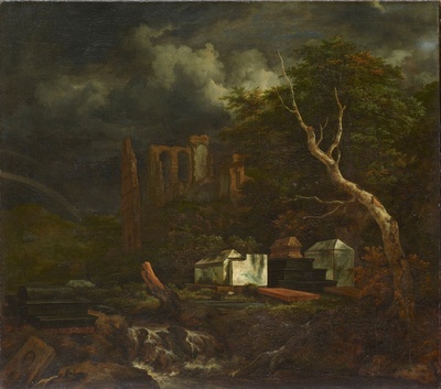 Es ist also gut möglich, dass Friedrich selbst nie einen nächtlichen Regenbogen in natura erlebt hat. Die Inspiration für sein Gemälde bekam er in der Dresdener Gemäldegalerie, genauer gesagt durch das Bild weiter links, Jacob van Ruisdaels Jüdischen Friedhof. Bei Ruisdael könnte man den Regenbogen links im Bild fast übersehen, Friedrich stellte ihn in das Zentrum seiner Komposition. Für beide Maler war der Regenbogen nicht nur ein Naturphänomen, sondern vor allem ein christliches Symbol: In der Genesis erscheint er nach der Sintflut als Zeichen der Versöhnung zwischen Gott und den Menschen.