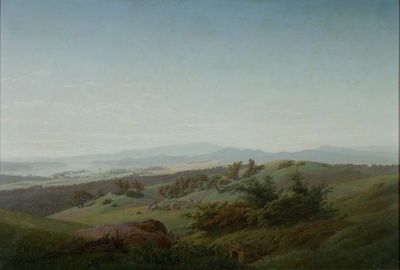 Weiter links sehen Sie ein zweites, ähnlich großes Gemälde, das auch das Böhmische Mittelgebirge zeigt, aber mit einer anderen Lichtstimmung. Friedrich hat sich sehr für die unterschiedlichen atmosphärischen Stimmungen von Landschaften interessiert und sie in unterschiedlichen Varianten gezeigt.
