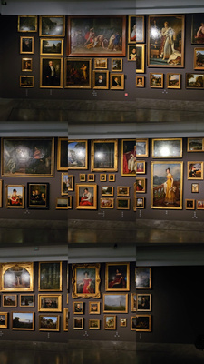 Unsere Präsentation entspricht der dicht gedrängten Hängung bei den Dresdener Akademie-Ausstellungen, die Friedrich verabscheute: „Es macht immer einen widrigen Eindruck auf mich in einem Saal oder Zimmer eine Menge Bilder wie Ware aufgestellt oder aufgespeichert zu sehen, wo Besucher nicht jedes Gemälde für sich getrennt betrachten kann, ohne zugleich vier halbe andere Bilder mitzusehen.“