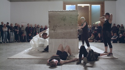 Der Künstler Carsten Saeger spricht über seine Videorarbeit. Die Themen Körper, Identität und Erinnerung bestimmen seine Werke. Das hier gezeigte Video beschäftigt sich mit der Konstruktion kollektiver Erinnerungen und nutzt dafür den menschlichen Körper als Medium. Es basiert auf einer Performance für die der Künstler die Denkmäler zur Völkerschlacht bei Leipzig im Jahr 1813 zum Ausgangspunkt nahm. Er ließ sich dabei von sogenannten Reenactments inspirieren, also von dem Nachstellen historischer Ereignisse durch Amateurinnen und Amateure in historisierender Kleidung als einem Akt des Gedenkens. In Saegers Video erkunden schwarz gekleideten Performer*innen mit ihren Körpern schrittweise die Denkmäler, setzen sich mit ihnen physisch auseinander und treten damit in eine ganz buchstäbliche Beziehung zu dem Ort und dem Akt des Gedenkens. In diesem Zusammentreffen wird die Fragilität des Lebendigen und die Monumentalität des zu Erinnernden spürbar. Zugleich nimmt die Gegenwart mittels der lebendigen Körper Besitz von dem Vergangenen.