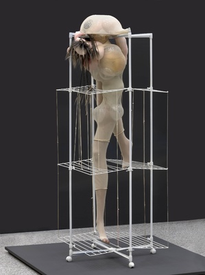 "Meine gesamte Kunst hat eine sexuelle Konnotation. Kunst, bei der das nicht der Fall ist, hat keine Existenzberechtigung. Ich arbeite aus vielen Richtungen, meine Arbeit muss daher necken, befriedigen und leiden und der betrachtenden Person Schuldgefühle auslösen", so beschreibt Madeleine Berkhemer ihren künstlerischen Antrieb. In den für sie typischen Materialskulpturen, aber auch in Performances, Fotocollagen und Zeichnungen, zerlegt sie den weiblichen Körper in seine Einzelteile, dehnt ihn im Raum aus, erschafft sinnliche und zugleich unheimliche Fleischgebilde. Dabei betreibt sie ein humorvolles Spiel mit weiblich konnotierten Materialien und Farben wie den auch hier verwendeten Strumpfhosen und greift auf die im Surrealismus erprobte Verfremdung des Körpers zurück. Den damit verknüpften sexualisierten, voyeuristischen und pornografischen Blick eignet sich Berkhemer aus feministischer Perspektive an.