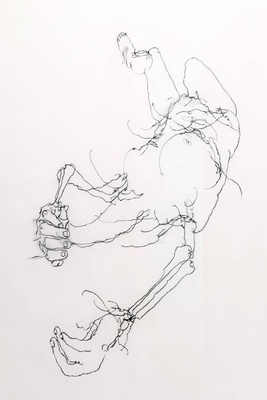 In starker Verkürzung und leichter Verdrehung streckt sich uns ein weiblicher Körper ohne Kopf entgegen. Dass die Arme skelettiert sind, Hände und Körper hingegen nicht, macht die Figur noch schauriger und scheint sie bildlich zunächst in einen Zusammenhang mit sexuellem Verbrechen und Horror zu rücken. Tatsächlich ist der Horrorfilm für Chloe Piene eine künstlerische Referenz, die in ihren Videoarbeiten noch sichtbarer wird als in den Zeichnungen. Diese knüpfen in ihrer Verbindung von Erotik und Tod an die künstlerischen Bewegungen des Symbolismus und des Expressionismus an. Das Zeichnen selbst wird bei Piene zu einem meditativ-ekstatischen Akt. Im Trancezustand ziehen sich für sie die Grenzen der Darstellung des Menschen neu: Körper verwandeln sich in hybride Wesen zwischen sexueller Lust und körperlicher Zersetzung. Mittels Konturlinien auf weißem Grund spürt Piene im Ausdruck des Extremen den nahezu fantastischen Facetten des Menschseins nach.