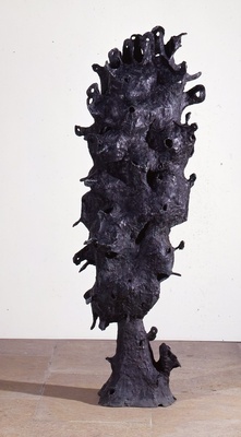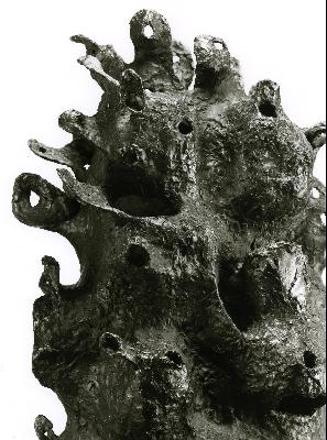 Der Mythos der Daphne aus Ovids "Metamorphosen" ist seit Jahrhunderten ein beliebtes Thema in der Kunst: Der von einem Liebespfeil Amors getroffene Gott Apollon verfolgt die Nymphe Daphne. Sie jedoch, von einem gegenteiligen Pfeil Amors getroffen, flieht. Bald sieht sie nur einen Ausweg, um sich Apollons Verlangen zu entziehen: Sie verwandelt sich in einen Lorbeerbaum. Emil Cimiottis zwei Meter hohe Bronzeskulptur, die grob die Umrisse eines Lorbeerbaumes aufgreift, zeigt den Moment, in dem Daphne vollständig in der pflanzlichen Gestalt aufgegangen ist. Menschliche Züge lassen sich nicht mehr erkennen. Und doch geht von der Skulptur etwas Bewegt-Lebendiges aus: Die raue Oberfläche wird durch das Spiel von Licht und Schatten belebt, die mundartigen Öffnungen ermöglichen Ein- und Durchblicke, die herausragenden flachen "Blätter" erinnern an Finger.