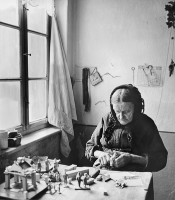 Auguste Müller wurde als Tochter eines Spielzeugmachers und Drechslers in eine arme Familie hineingeboren. Sie arbeitete zunächst als Spielzeugmacherin ohne formelle Ausbildung und fertigte vor allem die üblichen Massenprodukte an. Ein späteres Foto zeigt sie beispielsweise bei der Ablieferung eines Kartons voller Schachfiguren. Vermutlich zu Beginn des 20. Jahrhunderts begann sie jedoch, neben ihrem Broterwerb auch kleine Schnitzarbeiten aus Holzresten herzustellen. Diese Figuren und Figurengruppen waren stets mit kleinen handschriftlichen Zetteln versehen, auf denen sie ihre eigenen Interpretationen und Kommentare zu den dargestellten Szenen hinterließ.