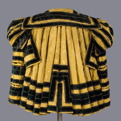 - Oberstoff Seidendamast gelb; Borten Seidensamt blau-schwarz, Silberschnürchen; Zierknoten Seidensamt grau-braun, Goldgespinst.