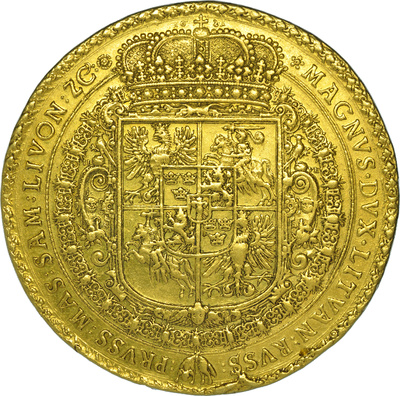 Rainer Grund: Ganz richtig! Außerdem sind beide Seiten beschriftet. Auf der Vorderseite steht unter anderem Sigismundus und Poloniae, also Sigismund von Polen. Und gleich noch eine Frage: was glaubt ihr, wie schwer die Münze ist? – Einen Hinweis noch: Die Münze hat den Wert von 100 Dukaten.