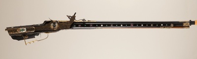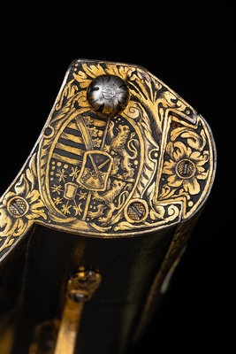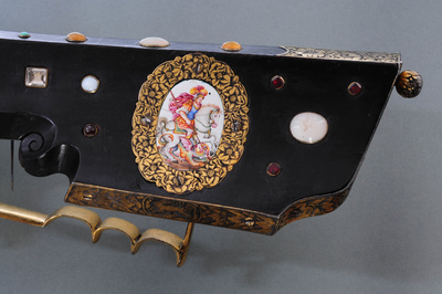- Lauf Eisen geschmiedet, gezogen, gebläut, geschnitten, graviert, vergoldet, Korn Gold; Schloss Eisen vergoldet, graviert, emailliert, Granat; Schäftung Nussbaumholz geschnitzt, gebeizt, besetzt, Amethyst, Opal, Türkis, Spinell, Rubin in Kastenfassungen, Email; Ladestock Eisen, teils vergoldet, Holz