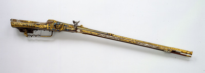 - Lauf Eisen, gezogen, geschnitten, teils kanneliert, vergoldet und gebläut, Signatur geschlagen, Auflagen Messing vergoldet, teils durchbrochen, geschuppt; Schloss Eisen gebläut, Auflagen Messing vergoldet, durchbrochen, Hahn Eisen blank, graviert/geätzt, mit Pyrit in Blei; Schäftung Holz verschnitten, Beineinlagen graviert, Tiefen geschwärzt, Eisenplatten gebläut, darauf Messingauflagen durchbrochen, vergoldet; Ladestock Holz, Dopper Messing, vergoldet?, graviert, geschnitten.