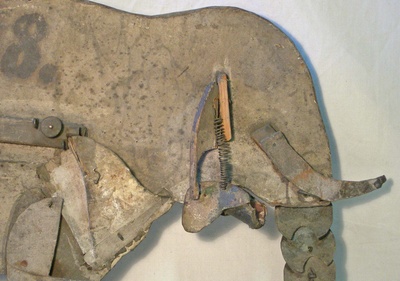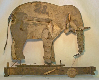 Die etwa zehn bis 40 Zentimeter hohen Figuren aus Holz, Blech oder Pappe wurden auf mehreren hintereinander angeordneten Schienen bewegt. Der hier ausgestellte Elefant vom Puppenspieler Curt Kressig (1883-1970) gehört ebenso dazu wie die anderen Figuren in dieser Vitrine. Er war aber schon der vierte Besitzer dieser Figuren.
