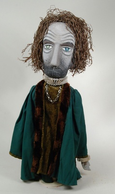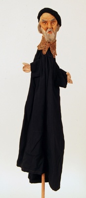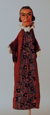 In unserer Faust-Vitrine sind verschiedene Faust-Puppen ausgestellt, sowohl Marionetten als auch Handpuppen. – Eines unserer Lieblingsstücke ist Frieder Simons Handpuppe „Faust“ aus dem Stück „Das Puppenspiel vom Dr. Faust“ (1963) mit dem riesigen grauen Kopf und der markanten Brille. Die Haare bestehen aus Kabelstücken. Frieder Simon (1936-2020), seit seiner Kindheit mit dem Puppenspiel verbunden, prägte mit seinem „Original Kunstfiguren- & Caspertheater LariFari“ die Puppenspielkunst. Gemeinsam mit seiner Frau, der Textilgestalterin Barbara Dushe, die die Kostüme herstellte, schuf er Figuren und Inszenierungen, die oft auf klassischen Stoffen basierten.