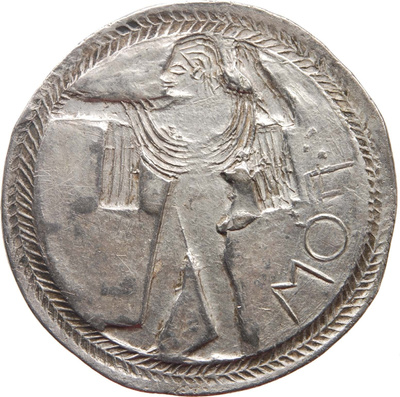 Um 630 vor Christus tauchten die ersten Münzen auf – im westlichen Kleinasien. Weil sie so gut handhabbar waren, verbreiteten sie sich schnell im gesamten Mittelmeerraum. Auch in Süditalien. Griechische Auswanderer gründeten dort neue Städte: Metapont, Tarent, Kroton, Sybaris oder in der historischen Landschaft Lukaniens die Stadt Poseidonia. Bis heute zeugen die Reste der gewaltigen Tempelruinen, darunter die des so genannten Poseidontempels, vom einstigen Reichtum. Poseidon stand nicht nur Pate für den Namen der Stadt, er war auch ihr Hauptgott. Klar, dass er das vorherrschende Motiv auf den Münzen aus Poseidonia war.