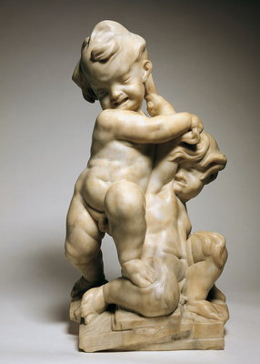 Niedlich sehen sie aus, wie junge Hunde beim Spielen. Doch der erste Eindruck täuscht, denn hier wird kein Spiel gezeigt. Der auf dem Boden kniende Putto weint vor Schmerz, während sein Gefährte zum nächsten Schlag ausholt. In beiden Gesichtern finden wir nichts Niedliches. Im Gegenteil, denn es sind zwei Affekte höchst realistisch dargestellt: Zorn und Schmerz. Was sehen wir hier?