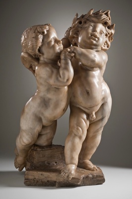 Wenn Sie sich umdrehen und einen Blick aus dem Fenster auf den Zwinger werfen, können sie sehen, wann unser Puttenpaar entstanden ist. Ab 1709 arbeiteten Dresdner Bildhauer unter der Leitung von Baltasar Permoser am Figurenprogramm des Zwingers. Unter ihnen Paul Heermann, der kurz zuvor von Italien nach Dresden gekommen war, um hier sesshaft zu werden. Neben seiner Arbeit am Hof nahm er auch Aufträge reicher Privatleute an. Unser aus feinstem Alabaster gemeißeltes Paar entstand um 1712 für den Leipziger Kaufmann Johann Zacharias Richter.