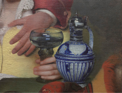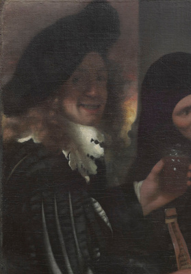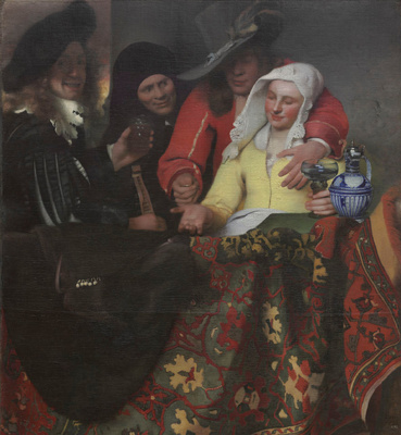Eine lockere Gesellschaft aus vier nahezu lebensgroßen Figuren hat sich hinter einer Balustrade zusammengefunden. Während der elegante Freier gerade dabei ist, das schöne, in strahlendes Gelb und Weiß gekleidete Mädchen für seine Dienste zu bezahlen, betrachtet die schwarzgekleidete Kupplerin beide mit argwöhnischem Lächeln. Der Musiker links lädt dazu ein, den zwielichtigen Geschäftsabschluss aus nächster Nähe mitzuerleben. Vermeer richtete hier sein Hauptaugenmerk auf die Ausgewogenheit von Farben, Formen und Strukturen im Bild.