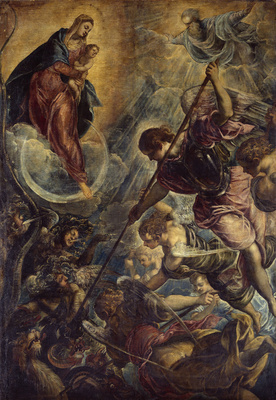 Wer dieses Werk bei Tintoretto in Auftrag gab, ist unbekannt, aber die Dynamik der Komposition spricht auch heute noch zu jedem Betrachter. Sie macht unmissverständlich klar, dass der Drache keine Chance gegen den Erzengel Michael und sein Gefolge hat. Gottvater selbst lenkt die Rettung der apokalyptischen Frau auf der Mondsichel, die traditionell als Maria mit dem Jesuskind interpretiert wird. Die Offenbarung des Johannes, das letzte Buch des Neuen Testaments, schildert diesen kosmischen Kampf als Prophetie.