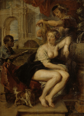 Einem Bericht aus dem Alten Testament folgend schilderte Rubens die schöne Bathseba im Hof des Palasts von König David bei der Toilette. Von links kommt ein Page, der Bathseba seinen Brief überbringt. David war Bathseba in Liebe verfallen, rief sie zu sich, und sie wurde schwanger. Um das Unrecht zu vertuschen, schickte er ihren Gatten Uria in die vordere Linie einer Schlacht, wo dieser starb. Vermutlich ließ sich Rubens durch die Schönheit seiner zweiten, jungen Frau Hélène Fourment zu diesem Spätwerk anregen.