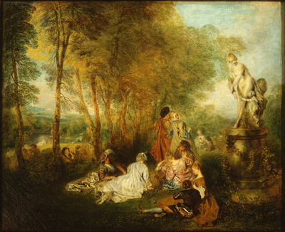 Eine Erklärung ist vielleicht, dass die Bildgattung der fêtes galantes stark von der Commedia dell’arte beeinflusst war. Das traditionelle italienische Stehgreiftheater erfreute sich im Paris des 18. Jahrhunderts großer Beliebtheit.
