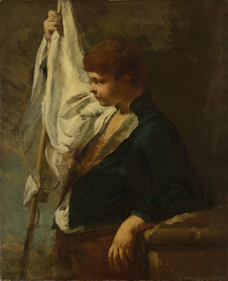 Erschöpft steht ein Junge an einem Steinsockel, die Fahne in der Hand. Durch das starke Licht, das das Weiß der Fahne aus dem Dunkel herausschält, erhält die Szene eine dramatische Stimmung. Auch wenn der Knabe wohl nicht zu einer konkreten Historie gehört, hat man den Eindruck, als sei in dieser einzelnen Figur eine große Geschichte gleichsam verdichtet. Ein Agent des sächsischen Kurfürsten Friedrich August II. kaufte dieses Bild – wie auch die Darstellung Davids (Gal.-Nr. 570) – direkt beim Künstler in Venedig.