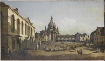 Bellotto führt den Blick entlang der Fassade der Gemäldegalerie über den Neumarkt zur Frauenkirche. Aus der Pirnaischen Gasse kommend fährt Friedrich August II., Kurfürst von Sachsen und König von Polen, in der von sechs Schimmeln gezogenen Staatskarosse vor. Sein Ziel ist die 1747 eröffnete Gemäldegalerie. Die berühmte Bilderkollektion, die von seinem Vater August dem Starken und ihm selbst zusammengetragen wurde, befand sich in diesem Gebäude, bis sie 1855 in die Sempergalerie am Zwinger umzog.