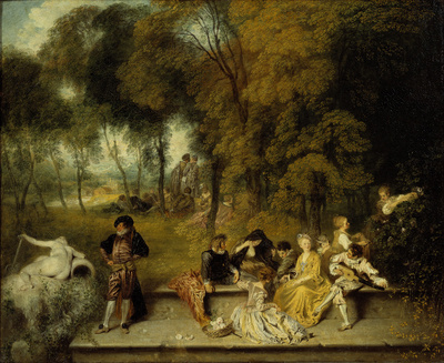 Eine prächtig ausstaffierte höfische Gesellschaft sitzt auf einer Steinmauer in einer Parklandschaft, plaudert und lauscht einem Musikanten. Links blickt ein luxuriös gekleideter Junggeselle auf die Brunnenfigur einer liegenden nackten Nymphe, die die frivole, lockere Stimmung des Bildes bereichert. Die Darstellung gehört zu der Bildgattung der „Fêtes galantes“ („Galante Feste“), die sich zu Beginn des 18. Jh. in Frankreich großer Beliebtheit erfreuten und deren Erfinder Watteau war.