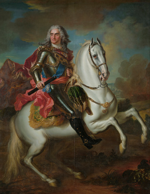Reiterbildnisse als Darstellungstypus für Herrscher sind seit der Antike äußerst beliebt. Vor allem im Barock kamen sie den Königen und Fürsten entgegen, da sie deren Anspruch, über andere erhaben zu sein und souverän zu herrschen, besonders deutlich zum Ausdruck brachten. Das Gemälde hält einen Moment voller energischer Bewegung fest, der König richtet seinen Blick selbstbewusst auf ein Ziel außerhalb des Bildfeldes. Die Rauchwolken im Hintergrund verweisen auf seine Rückkehr aus einer siegreichen Schlacht.