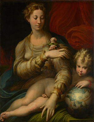 Der Künstler macht es uns schwer zu entscheiden, ob wir hier Maria mit dem Jesuskind oder die römische Liebesgöttin Venus mit Amor sehen. Der Knabe hält eine Rose, das Symbol der Liebe. Die Weltkugel verweist auf die allumfassende Geltung der Liebe. Ob es sich dabei um die himmlische oder die profane Liebe handelt, bleibt dem Betrachter überlassen. Parmigianinos Gemälde ist ein erster Höhepunkt in der Kunst des Manierismus. Die Ambivalenz in der Bildaussage ist typisch für diese Epoche.