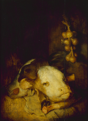 Vieles an diesem Stillleben ist eigenwillig: das Hochformat, das sparsame Arrangement, die Kalbsköpfe – im Gegensatz zu den Niederlanden war es in der deutschen Malerei nicht üblich, geschlachtete Tiere zu malen. Nicht ungewöhnlich dagegen sind Malweise, Lichtregie und die Konzentration auf die Hauptmotive, während der umgebende Raum weitgehend im Dunkeln bleibt.