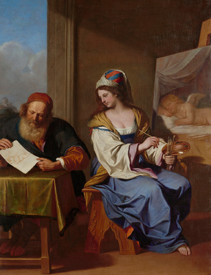 Dieses Gemälde thematisiert das Verhältnis von Zeichnen und Malen, eine seit dem 15. Jh. vielfach diskutierte Frage. Beide Künste sind als Personifikationen dargestellt. Der alte Mann steht für das Zeichnen, er hält ein Blatt mit der Skizze eines Amors. Die Verkörperung der Malerei blickt auf diese Zeichnung, um das Motiv auf der Leinwand zu malen. Durch das Zeichnen wird also am Anfang eines künstlerischen Prozesses die grundlegende Idee entwickelt. Doch erst die Malerei vermag dem Motiv mit Farben Leben zu verleihen.