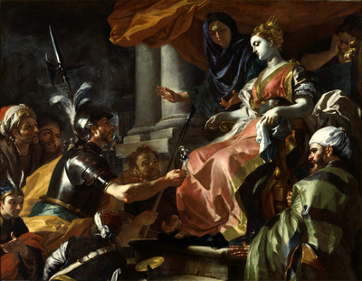 Solimena ist einer der Hauptmeister des Spätbarocks in Neapel, der hier mit allen Mitteln der dramatischen Gestaltung eine Szene aus dem Kampf zwischen Karthago und Rom darstellt. Als der römische Feldherr Scipio die Auslieferung der numidischen Königin Sophonisbe verlangte, ließ ihr Ehemann ihr Gift durch einen Boten schicken. Sie trank den Giftbecher, um der Gefangenschaft zuvorzukommen. Das Bild war Teil einer Serie über berühmte Frauen, in denen Solimena Aspekte der Liebe und Ehe thematisierte (vgl. Gal.-Nr. 501).