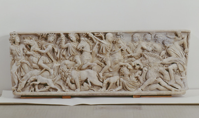 Das Relief ist Teil eines Sarkophags und zeigt den Verstorbenen als Jäger. In der Mitte der vielfigurigen Darstellung reitet er mit erhobener Lanze nach rechts und ist im Begriff, einen Keiler zu erlegen.
