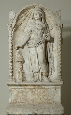 Über einer massiven Sockelzone mit querrechteckigem Inschriftenfeld steht eine Frau mit ausgestreckter Hand. Die sie umgebende Architektur – zwei gedrehte Säulen und ein muschelförmiger Giebel – erinnert an einen kleinen Tempel, in welchem sie ein Weihrauchopfer darbringt: Aus dem runden Behältnis (Acerra) hat sie die harzigen Weihrauchkörner entnommen und streut sie in die Flammen des rechts neben ihr stehenden Turibulums. Dieser Räucherständer besteht hier aus einer dreiseitigen Basis, dem Schaft und der Opferschale. Die mittelalte Frau trägt geflochtene Zöpfe, die über dem leicht gewellten Haupthaar zu einem Turban eingedreht sind – eine Modefrisur damaliger Zeit, wie sie auch die Kaiserin Faustina die Ältere (105–140 n. Chr.) trug. Obwohl sie ihren Mantel fromm um den Unterkörper geschlungen und über den Hinterkopf gezogen hat, betont der hochgegürtete und körpernahe Chiton ihre weiblichen Formen. Wer die Dargestellte ist, bleibt ungewiss; da aber ein weiteres Porträt von ihr überliefert ist, handelt es sich wahrscheinlich um eine Angehörige der römischen Oberschicht.