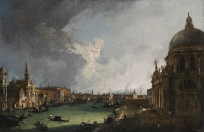 Die zwei kleinen Ansichten des Canal Grande gehören zu Canals frühesten überlieferten Veduten (vgl. Gal.-Nr. 586). Hell-Dunkel-Kontraste bestimmen die Bilder, wobei die Farben im Glanz der Sonne regelrecht aufleuchten. Der freie Pinselstrich, mit dem die Farben locker nebeneinander gesetzt wurden, wirkt fast modern. Indem der Künstler hier die Kirche Santa Maria della Salute im Schatten belässt, kann er die Kraft des Lichts umso mehr entfalten. Links hinten ist der Dogenpalast zu erkennen.